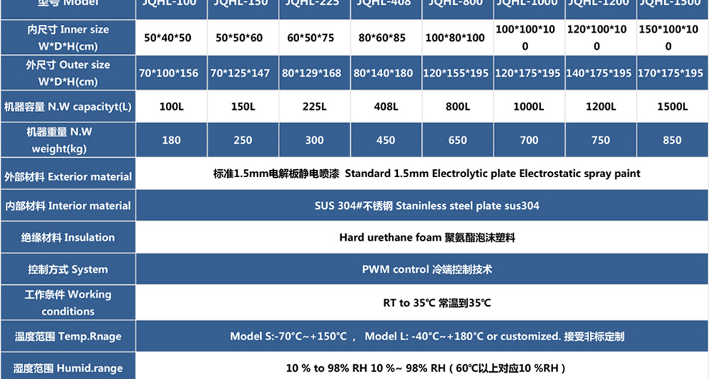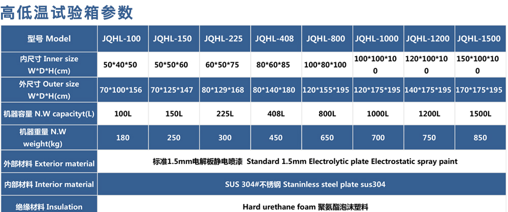 用途:高低溫試驗(yàn)箱 JQHL-100L-1000L為電子、電工、儀表、零部件、材料等試驗(yàn)樣品進(jìn)行高溫、低溫、或者恒定試驗(yàn)的溫度環(huán)境變化后的參數(shù)及性能測試。適用于汽車、航空、高校,專業(yè)實(shí)驗(yàn)室研究開發(fā)