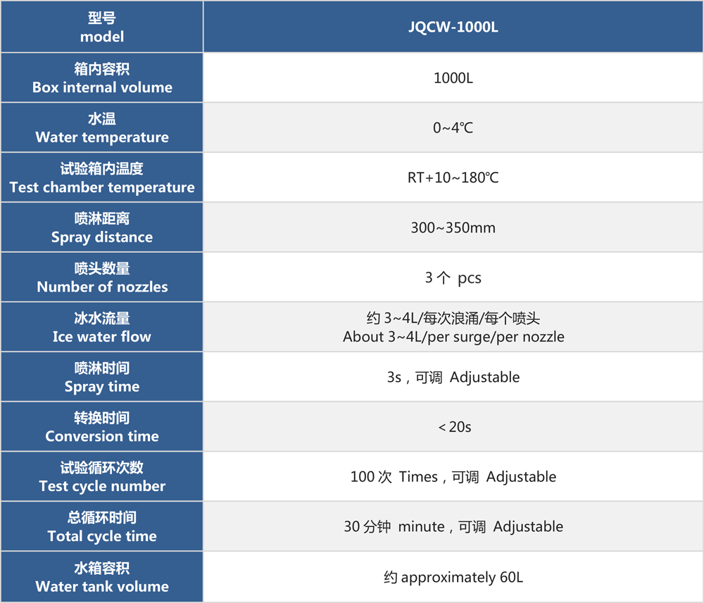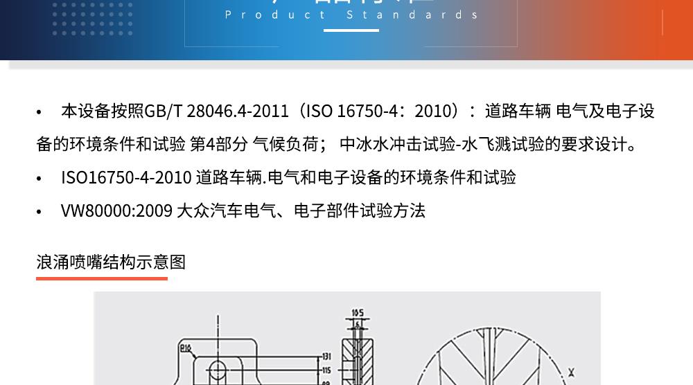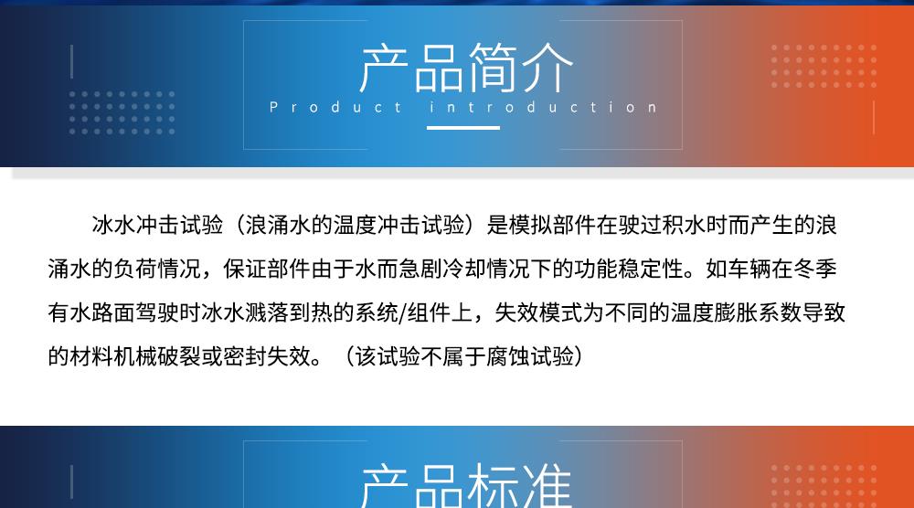 用途:冰水沖擊試驗(浪涌水的溫度沖擊試驗)是模擬部件在駛過積水時而產生的浪涌水的負荷情況,保證部件由于水而急劇冷卻情況下的功能穩(wěn)定性。如車輛在冬季有水路面駕駛時冰水濺落到熱的系統(tǒng)/組件上,失效模式為不同的溫度膨脹系數(shù)導致的材料機械破裂或密封失效