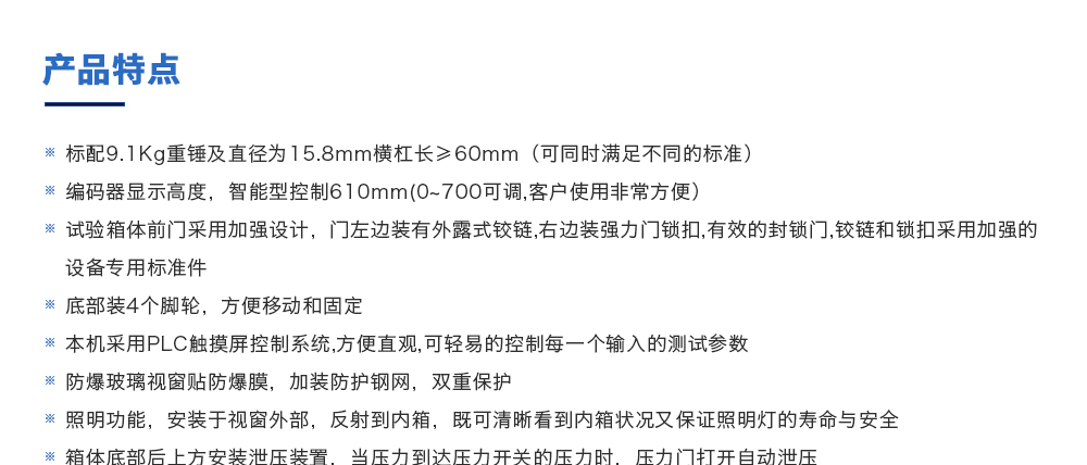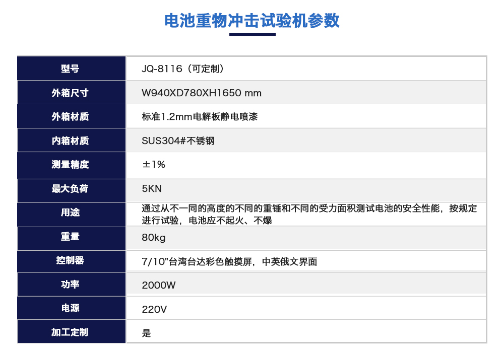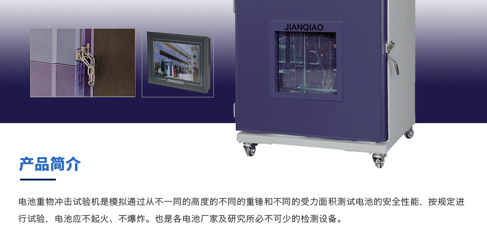 產(chǎn)品型號(hào):JQ-8116(定制款) 品牌:劍 喬 用途:電池重物沖擊試驗(yàn)機(jī)是模擬通過(guò)從不一同的高度的不同的重錘和不同的受力面積測(cè)試電池的安全性能,按規(guī)定進(jìn)行試驗(yàn),電池應(yīng)不起火、不爆炸。也是各電池廠(chǎng)家及研究所必不可少的檢咨詢(xún)熱線(xiàn):13829135130