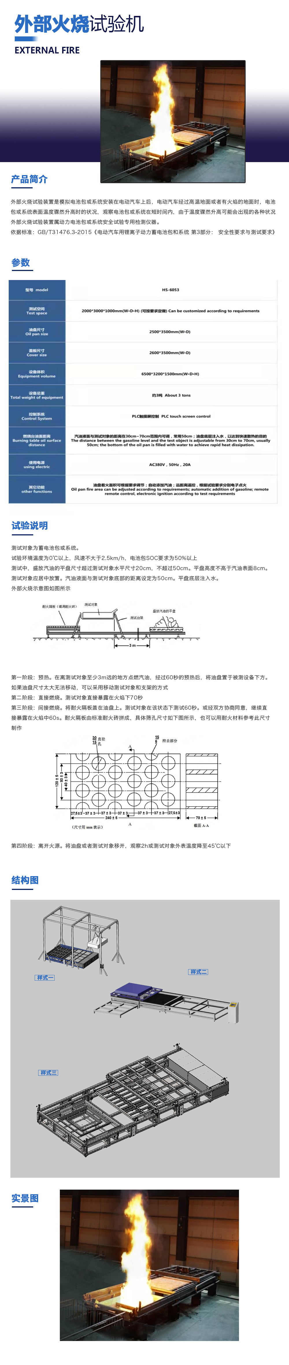 用途:外部火燒試驗裝置是模擬電池包或系統(tǒng)安裝在電動汽車上后,電動汽車經(jīng)過高溫地面或者有火焰的地面時,電池包或系統(tǒng)表面溫度驟然升高時的狀況,觀察電池包或系統(tǒng)在短時間內(nèi),由