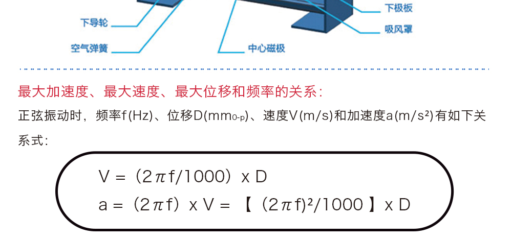 用途:正弦振動時(shí),頻率f(Hz)、位移D(mm0-p)、速度V(m/s)和加速度a(m/s2)有如下關(guān)系式: