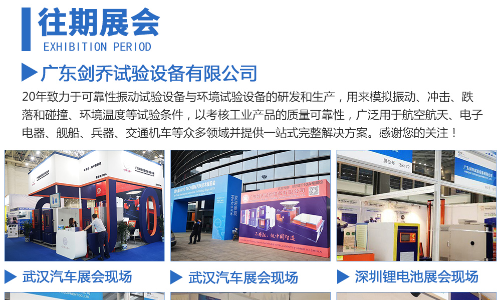 用途:廣東劍喬試驗設備有限公司,20年致力于可靠性振動試驗設備與環境試驗設備的研發和生產,用來模擬振動、沖擊、跌落和碰撞、環境溫度等試驗條件,以考核工業產品的質量可靠性,廣泛用于